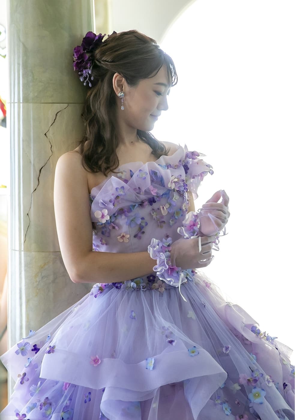 ・透明感のある彩佳様にぴったりのイブニングドレスをお選び頂き、また素敵にお召し頂きました事、お手伝いさせて頂きました私共も本当に嬉しく光栄です!ご家族皆様との仲睦まじいご様子がとても印象的でございました。