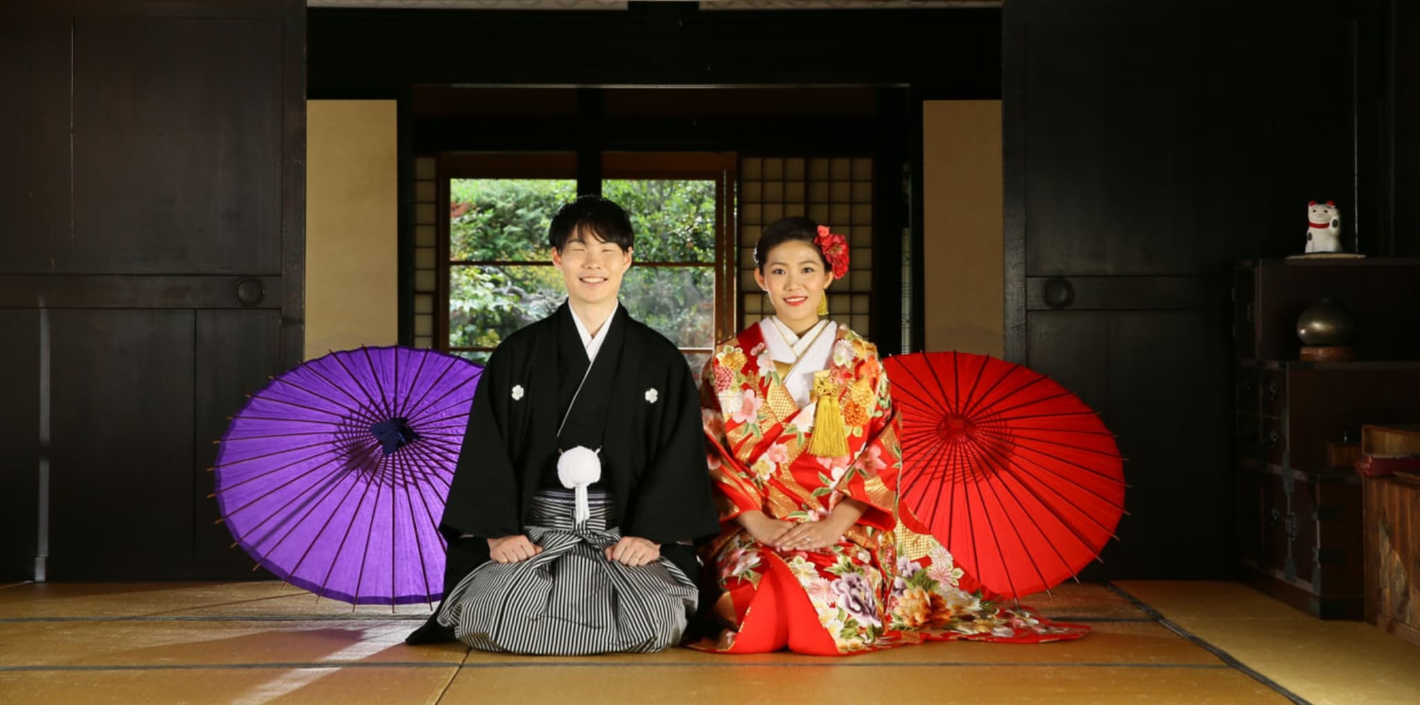 ・赤地に桜や牡丹の刺繡が印象的な大胆なお柄付けの色打掛をお選びいただきましたが、お庭のグリーンにもとても映えて、すごく素敵でございました。